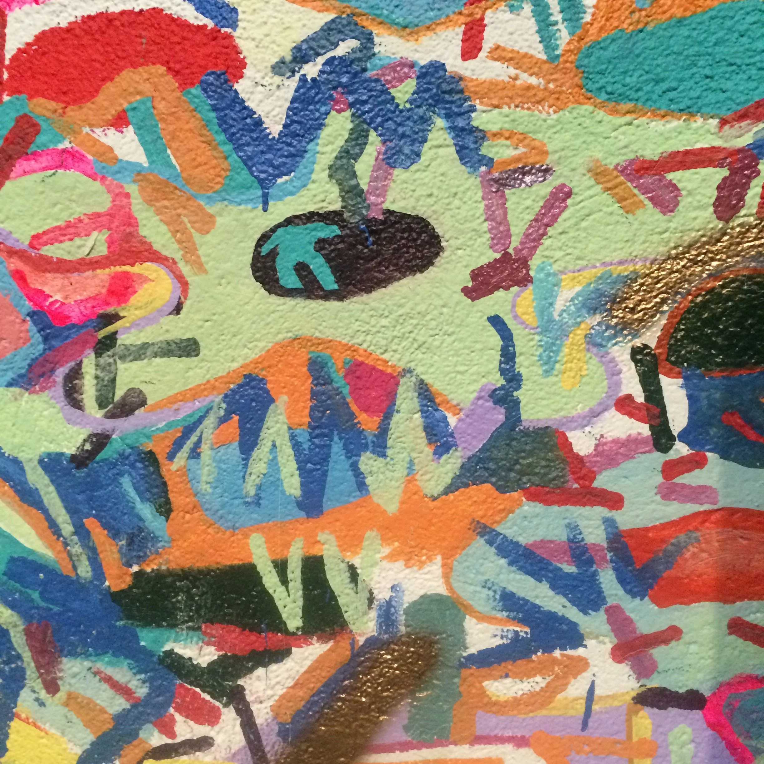 Details of overlapping patterns showing how our individual styles (unique forms of paint handling) blend together. I seem to recall the finer brush work here being from the hand of Stephan and the spray paint from the hand of Colin.